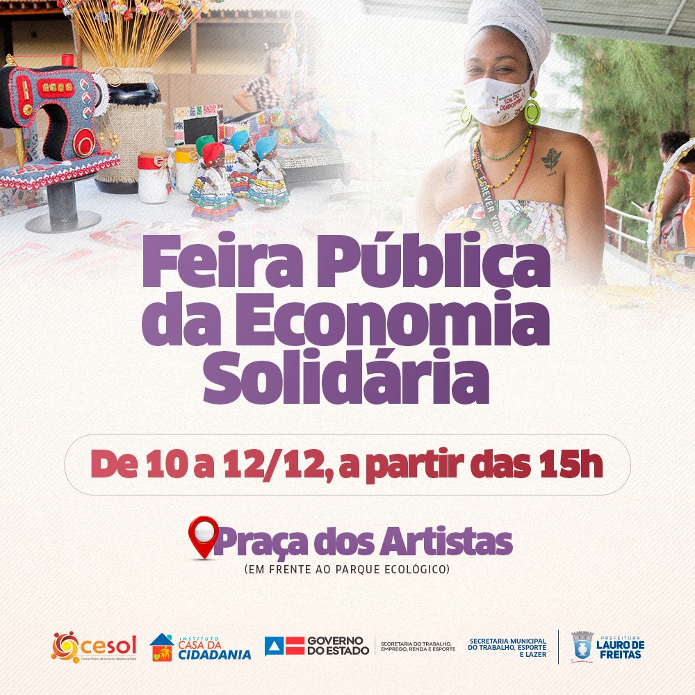 Garantir os presentes de Natal é bom, mas comprar itens produzidos em Lauro de Freitas é ainda melhor. Uma ótima opção é adquirir os itens para as festas de fim de ano na Feira da Economia Solidária-100 Edições, que vai reunir produtores municipais de diversas áreas, numa estratégia para fortalecer a economia local e ajudar pequenos comerciantes.