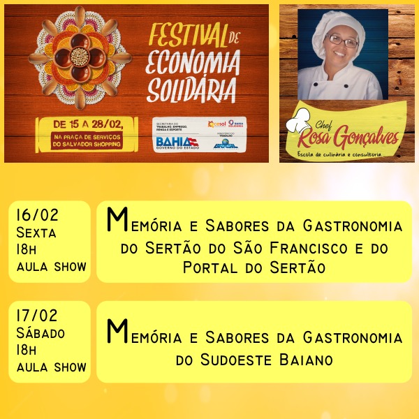 Um dos pontos fortes do Festival são as aulas-show de gastronomia, quando chefs de cozinha vão apresentar receitas elaboradas com produtos característicos dos territórios e que são produzidos por empreendimentos apoiados pelos Centros Públicos de Economia Solidária (Cesol).